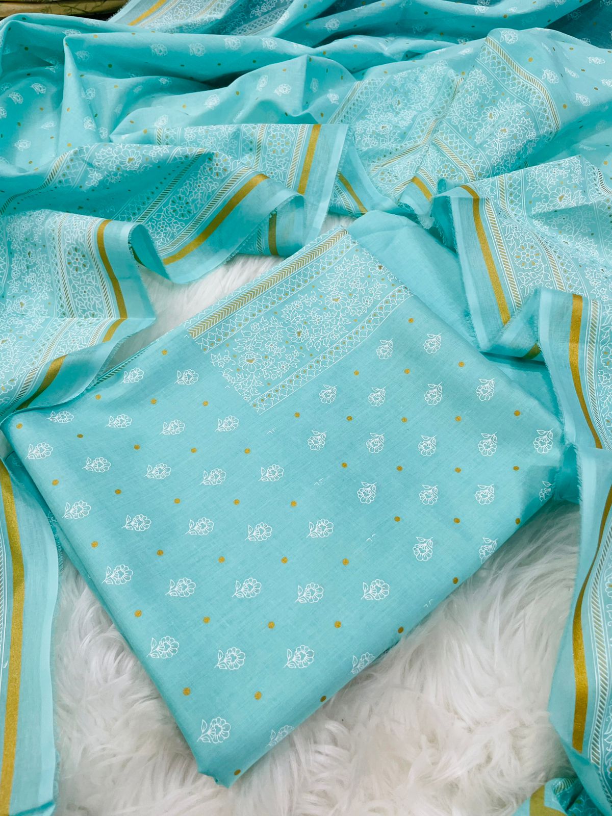 A stunning sky-blue lawn 3-piece suit featuring delicate white floral block print and shimmering golden dots. Lightweight, soft, and breathable — your perfect summer staple.