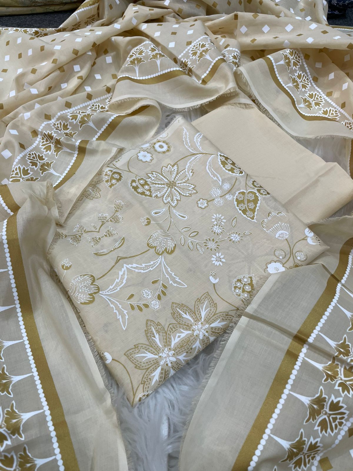 - Dupatta: Lawn with gold border, diamond print & pearl lace trim