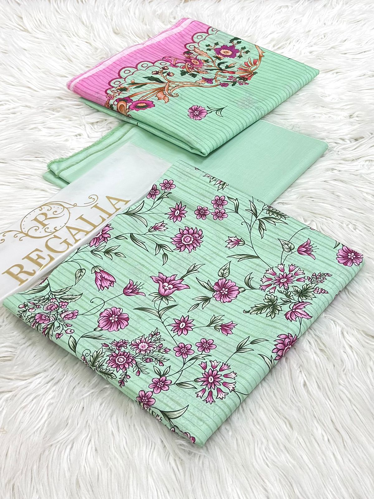 Be the first to review “Regalia Mint Blossom Pink Floral Printed Lawn 3-Piece Suit”