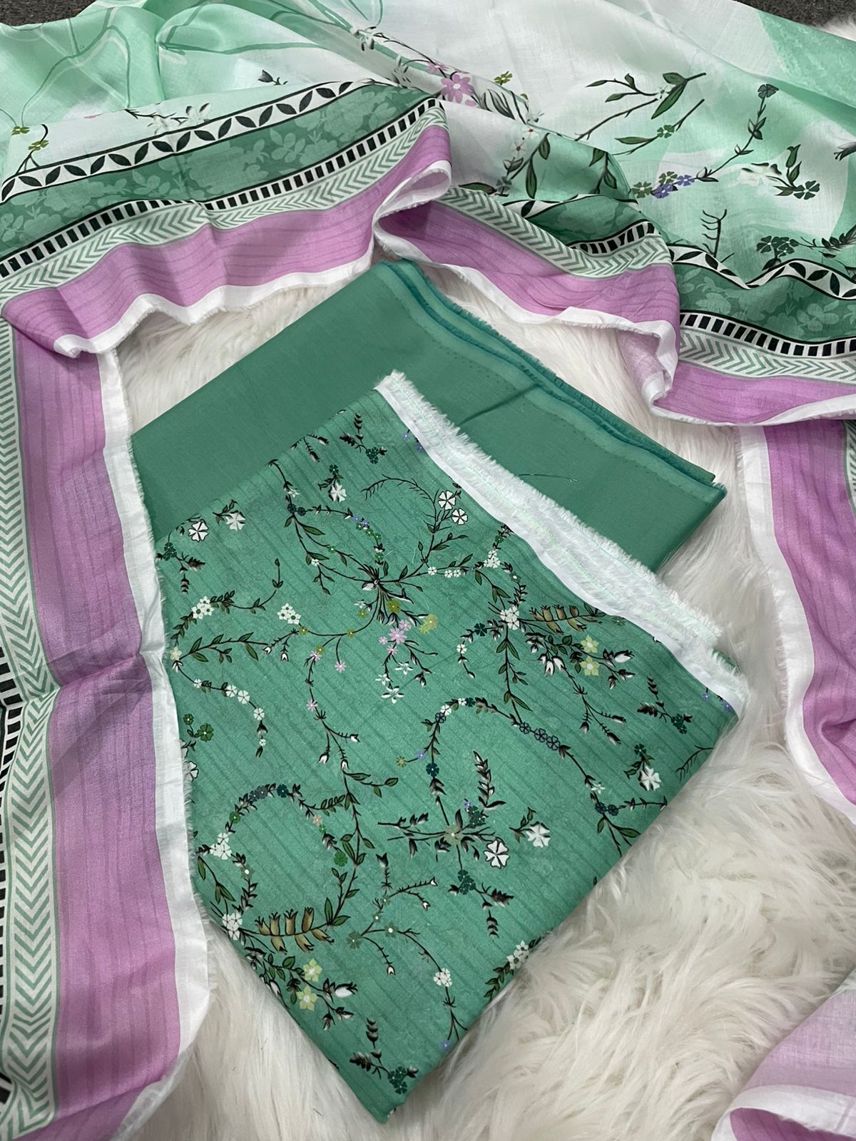 • Dupatta: Mint green with botanical print, lilac & white border, black chevron trim